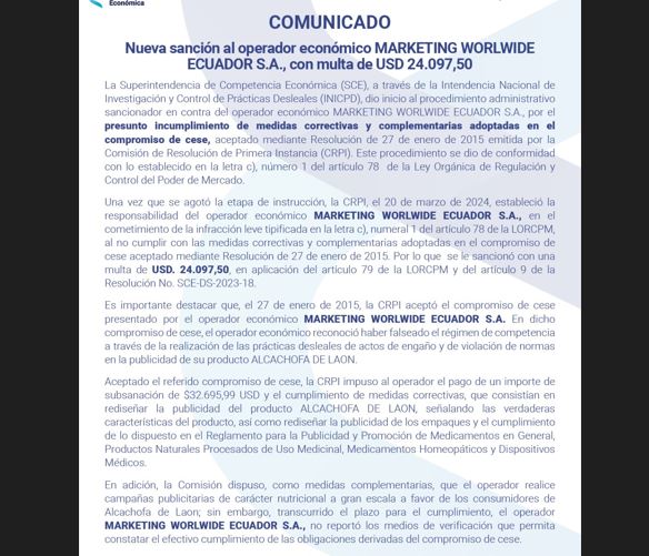 La Superintendencia de Competencia Económica (SCE), a través de la Intendencia Nacional de Investigación y Control de Prácticas Desleales (INICPD), dio inicio al procedimiento administrativo sancionador en contra del operador económico MARKETING WORLWIDE ECUADOR S.A.