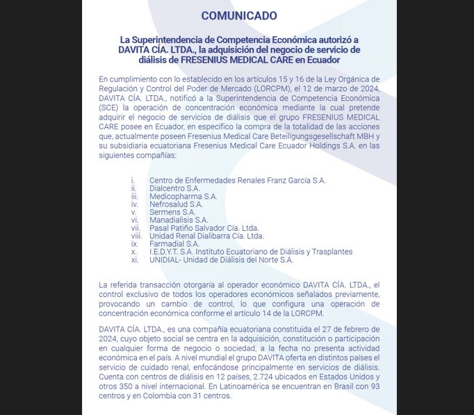 En cumplimiento con lo establecido en los artículos 15 y 16 de la Ley Orgánica de Regulación y Control del Poder de Mercado (LORCPM), el 12 de marzo de 2024, DAVITA CÍA. LTDA., notificó a la Superintendencia de Competencia Económica (SCE) la operación de concentración económica mediante la cual pretende adquirir el negocio de servicios de diálisis que el grupo FRESENIUS MEDICAL CARE posee en Ecuador.