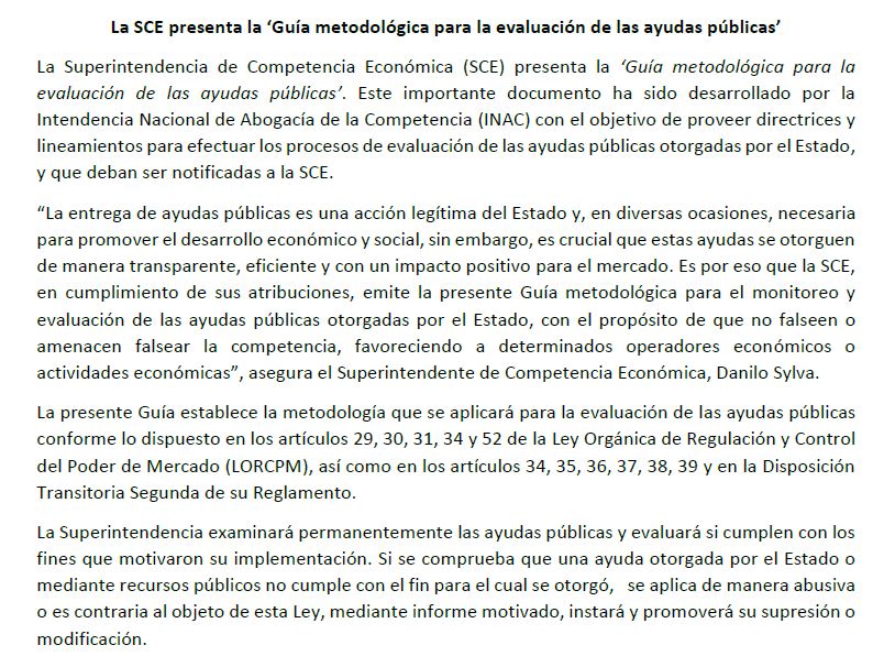 La Superintendencia de Competencia Económica (SCE) presenta la ‘Guía metodológica para la evaluación de las ayudas públicas’. Este importante documento ha sido desarrollado por la Intendencia Nacional de Abogacía de la Competencia (INAC) con el objetivo de proveer directrices y lineamientos para efectuar los procesos de evaluación de las ayudas públicas otorgadas por el Estado, y que deban ser notificadas a la SCE.