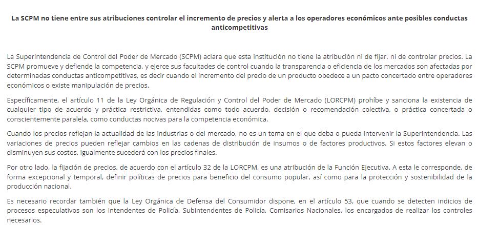 La Superintendencia de Control del Poder de Mercado (SCPM) aclara que esta institución no tiene la atribución ni de fijar, ni de controlar precios. La SCPM promueve y defiende la competencia, y ejerce sus facultades de control cuando la transparencia o eficiencia de los mercados son afectadas por determinadas conductas anticompetitivas, es decir cuando el incremento del precio de un producto obedece a un pacto concertado entre operadores económicos o existe manipulación de precios.