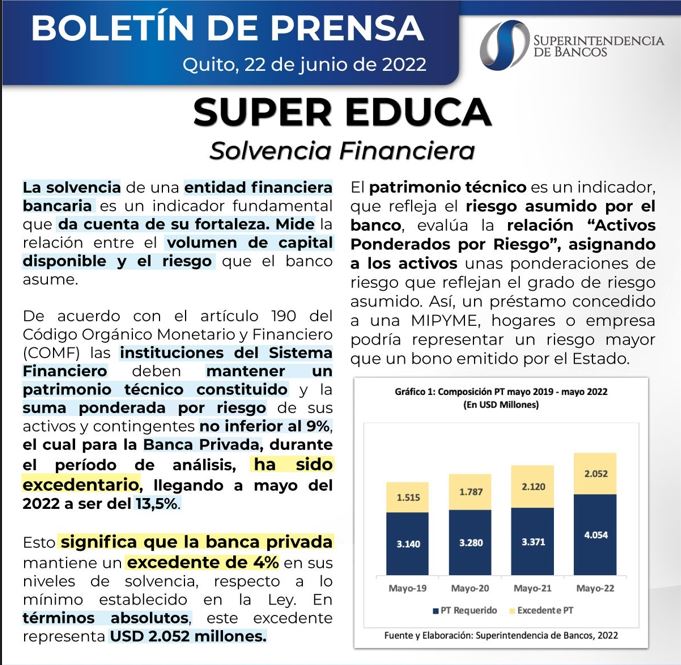 A mayo de 2022, la banca privada cuenta con un patrimonio técnico constituido de 13,5%, es decir mantiene un excedente de 4% en sus niveles de solvencia respecto al mínimo establecido en la Ley. (I)
