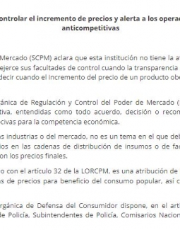 La Superintendencia de Control del Poder de Mercado (SCPM) aclara que esta institución no tiene la atribución ni de fijar, ni de controlar precios. La SCPM promueve y defiende la competencia, y ejerce sus facultades de control cuando la transparencia o eficiencia de los mercados son afectadas por determinadas conductas anticompetitivas, es decir cuando el incremento del precio de un producto obedece a un pacto concertado entre operadores económicos o existe manipulación de precios.