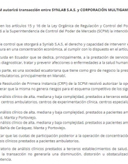 En cumplimiento con lo establecido en los artículos 15 y 16 de la Ley Orgánica de Regulación y Control del Poder de Mercado (LORCPM), el 28 de octubre de 2021, Synlab S.A.S. notificó a la Superintendencia de Control del Poder de Mercado (SCPM) la intención de adquirir la totalidad de acciones de Corporación Multigamma S.A.