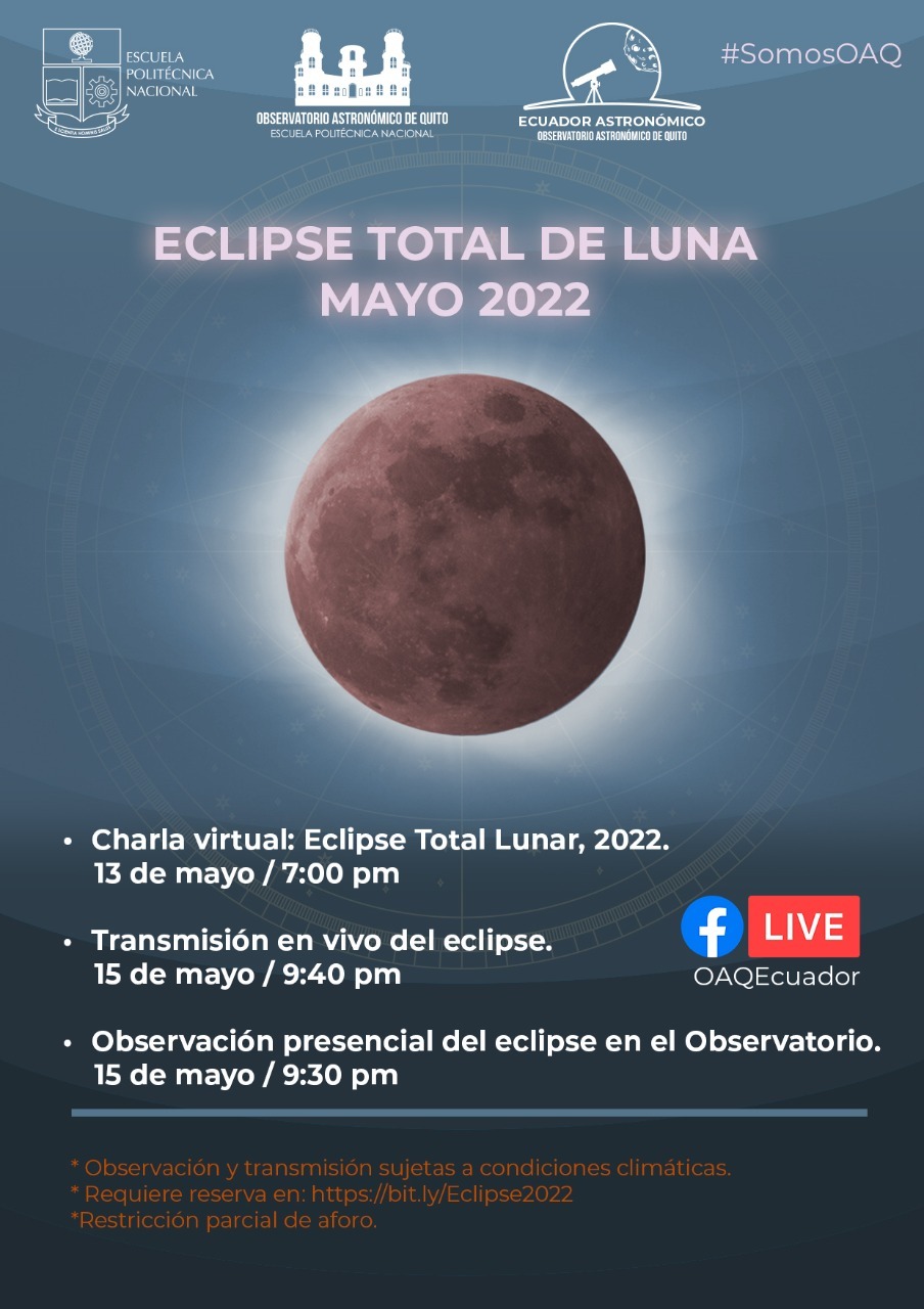 El Observatorio Astronómico de Quito (OAQ) de la Escuela Politécnica Nacional (EPN) informa a la ciudadanía que el domingo 15 de mayo de 2022 tendrá lugar un eclipse total de Luna. Este fenómeno astronómico será visible desde todo Ecuador.