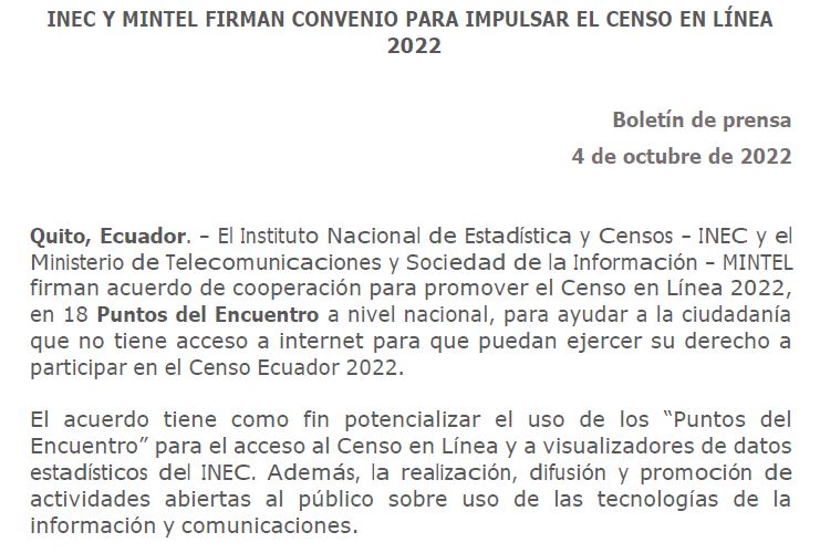El Instituto Nacional de Estadística y Censos – INEC y el Ministerio de Telecomunicaciones y Sociedad de la Información – MINTEL firman acuerdo de cooperación para promover el Censo en Línea 2022, en 18 Puntos del Encuentro a nivel nacional, para ayudar a la ciudadanía que no tiene acceso a internet para que puedan ejercer su derecho a participar en el Censo Ecuador 2022.